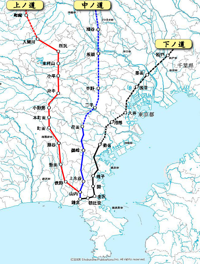 - 鎌倉〜巨福呂坂を通り、戸塚方面に向かった後、中山、荏田、二子を経て、渋谷・赤坂方面に向かう道と中野・板橋を経由する道とに分かれ、赤羽で合流。その後は、川口、岩槻、幸手、栗橋、古河へと向かう。