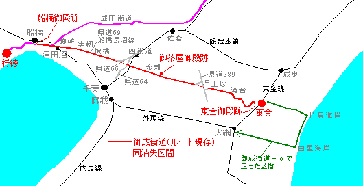 - 千葉県船橋市本町〜東金市田間〜山武市小松まで。約37kmをほぼ一直線に結んでいる街道である。