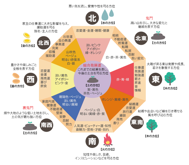 | 中央 | 土 | これまでの結果を表し、今後の土台を司る方位 | 総合発展運 | 紫・黄色・茶色・ベージュ |